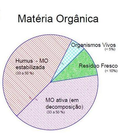 Um solo fértil e produtivo tem pelo menos 3 a 6% de matéria orgânica, que é composta pelos próprios organismos do solo, pelo resíduo fresco - restos de plantas, como folhas e raízes, e outros seres vivos, pela matéria orgânica em decomposição – a parte ativa, e pelo o húmus, a parte já decomposta e estabilizada.
