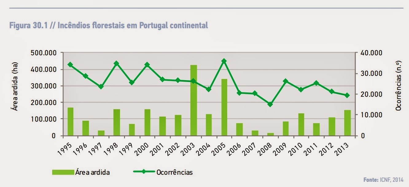 "Outro risco que tem grande impacto no ambiente nacional prende-se com os incêndios ocorridos em Portugal continental. Em 2013, contabilizaram-se 19291 ocorrências, resultando em cerca de 152 756 hectares de área ardida, dos quais 36.4% em povoamentos florestais e 63.6% em matos. Relativamente ao ano anterior arderam mais 42 524 hectares, o que se traduziu num acréscimo de 38.6% no total de área ardida."